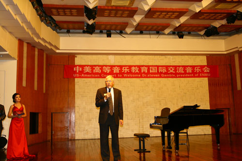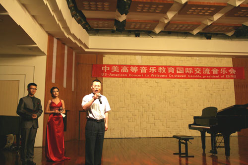 2012年5月23日,beat365在线唯一官网院长易柯教授在我院梧桐楼亲切接见美国来访东新墨西哥大学校长史蒂文. 盖博博士。双方畅谈在新时期如何进一步扩展双方的交流与合作,并就未来可能的合作办学模式进行了详尽磋商。当晚美国东新墨西哥大学校长史蒂文. 盖博博士应邀出席了我院歌剧与合唱系举办的中美高等音乐教育国际交流音乐会,我院副院长孙洪斌副教授出席晚会并致欢迎辞。
