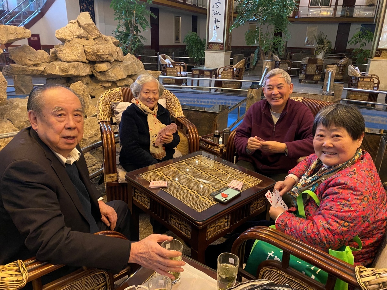 原党委书记谭维明、原副院级调研员杨建中和退休老同志愉快地进行双扣比赛