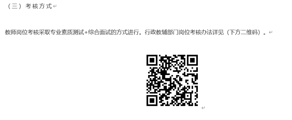 教师岗位考核采取专业素质测试+综合面试的方式进行。行政教辅部门岗位考核办法详见(下方二维码)。