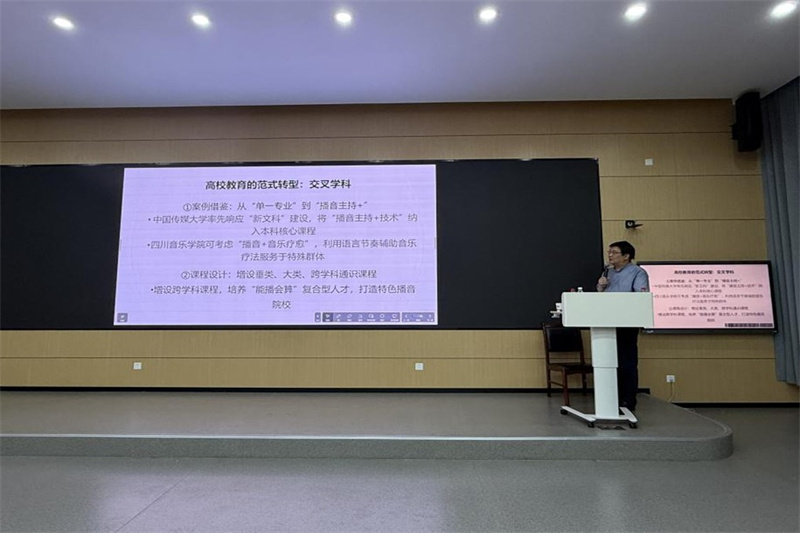 面对AI技术的冲击,马欣教授讲到:2030年40%基础播音岗位或被替代,但同时创意表达的需求将增长65%。他强调:“技术只是工具,人文才是灵魂。”面对挑战,高校在新时代应培养“能播会算”的复合型人才,确立以播音专业为主、强势学科为辅的整合发展思路。他举例说,川音传媒学院可尝试“播音+音乐疗愈”等创新复合型项目,并将其融入课程体系。另外,在拥抱AI技术的同时,也要坚守语言的规范与文化的传承,毕竟文化才是根基。