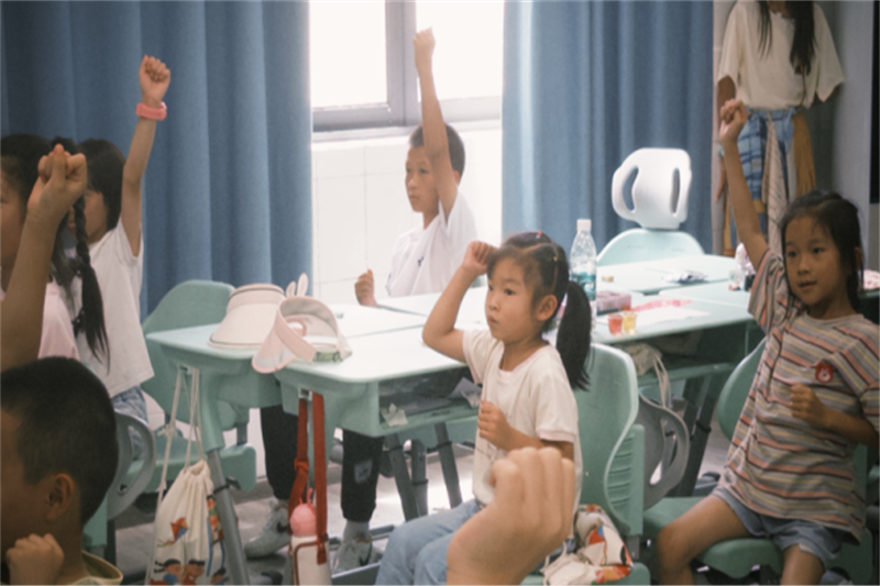 梅妮与钟语馨同学的手势舞课,让《开心向前飞》的旋律久久回荡。两位老师带领大家熟悉节奏,分解“飞翔”“微笑”等手势动作:双手叠成翅膀轻挥,指尖划出弧线如流星,掌心相对推出“向前”的力量。她们手把手调整手势角度,鼓励道:“让指尖带着开心飞起来呀!”孩子们跟着节奏摆动,稚嫩手掌在光影中起落,歌声与笑声交织。统一的律动中,童真与热忱共舞,陌生的心灵彼此靠近。这堂舞蹈课以手势为桥,让情感在光影与旋律中共鸣,悄然编织心与心的纽带。