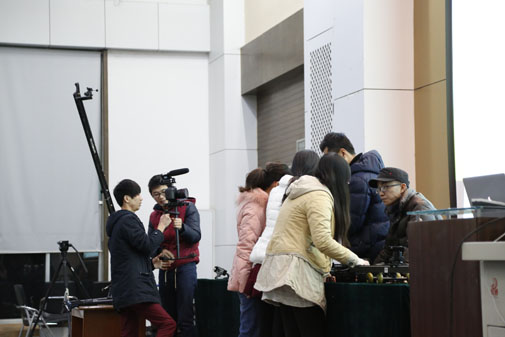 讲座在阿昆老师的自我介绍中拉开帷幕,随后他播放了由其影视工厂拍摄的短片集锦,视频十分唯美震撼,观众们都赞叹不已。短片放映完毕后,阿昆老师就短片做了具体详尽的讲解。其后,他向学生们介绍了各种专业镜头的区别与功能的优劣,最后还向同学们介绍了航拍小飞机、滑轨、稳定器等高级专业器材,使在场的同学们开拓了眼界。