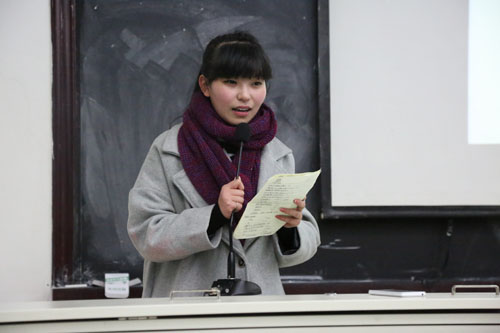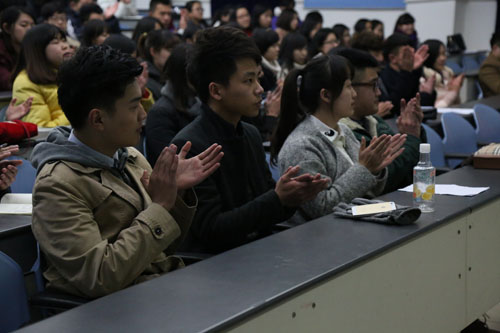 大会由学生会副主席马文淼同学主持,在学生会主席郑海怡同学的一段诙谐幽默的说唱中开场,气氛一下子便活跃起来,同学们对主席的表现都乐不可支。之后,大会播放了由学生会宣传部制作的学生会工作实绩照片流和学生会新年祝福视频,展示了这届学生会自组建以来近3个月所开展的一系列工作和学生会干部们对所有成员们的祝福。回顾过去3个月的工作,后方书记与张旭老师认真观看并频频点头。同学们回首往事感慨交加,展望新的一年,也都充满了期望与信心。