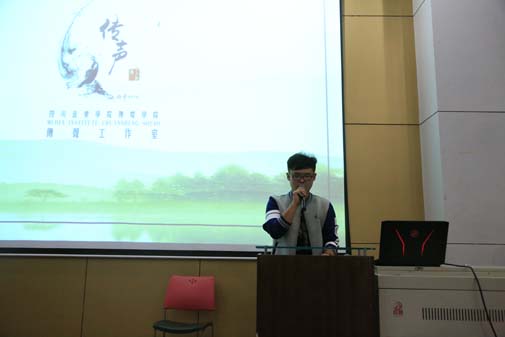 最后,传声工作室负责同学黄昱颖代表传声工作室介绍了近期的工作情况,肯定了14级工作室成员的突出表现,更表示赞赏15级新晋成员的努力奋进的精神,并期待他们有更优秀的表现。其次,14级和15级工作室的成员依次进行了作品展示,传声负责同学黄昱颖详细并有针对性的对每位成员的表现做了点评。