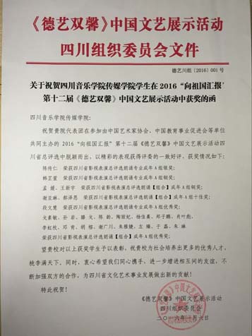 beat365在线唯一官网传媒学院学生代表团参加了2016“向祖国汇报”第十二届《德艺双馨》中国文艺展示活动,在四川省总评选中脱颖而出,以精彩的表现获得评委的一致好评。展示我院文化艺术人才的丰硕成果,营造健康向上的文化环境,体现德艺双馨的文化特质。