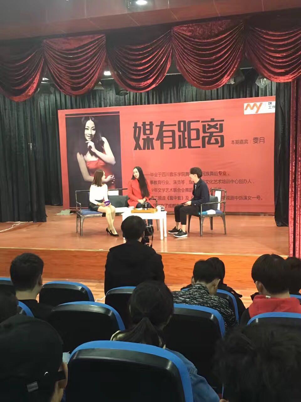 该活动是在我院党总支批准和支持下,邀请到成都市雯月文化传媒有限公司负责人雯月作为《媒有距离》访谈节目嘉宾。活动由我院媒有学生工作室主办,传媒学院李超老师指导,学院后勤李乾坤老师及14级学生潘楚乔同学进行必要设备支持,并得到学院原道创意学生工作室给予的拍摄录制等支持。