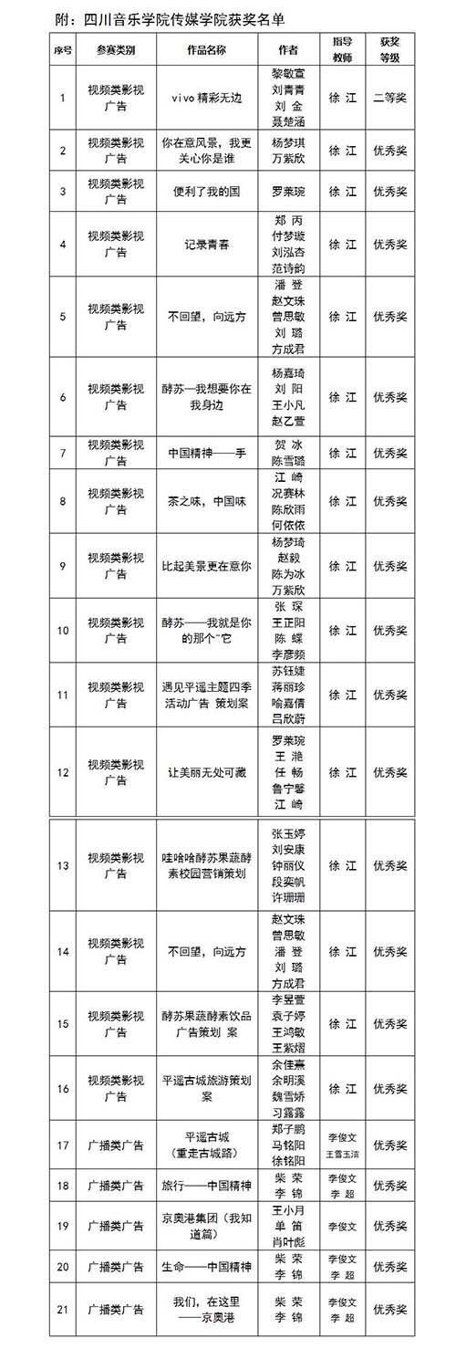 近年来,川音传媒学院高度重视各级各类学科竞赛,并以此作为教学的重要实践平台,使教学、实践和研究相结合。师生们借助“大广赛”、“夏青杯”等国家级赛事平台,认真组织、积极参与,通过专项赛事将专业理论应用到实际之中,提高了学生综合素质,使学生的创意思维、创新设计意识、团队协作精神和实践动手能力得到充分的锻炼,教学实践改革与就业需求的双赢效果初步显现。