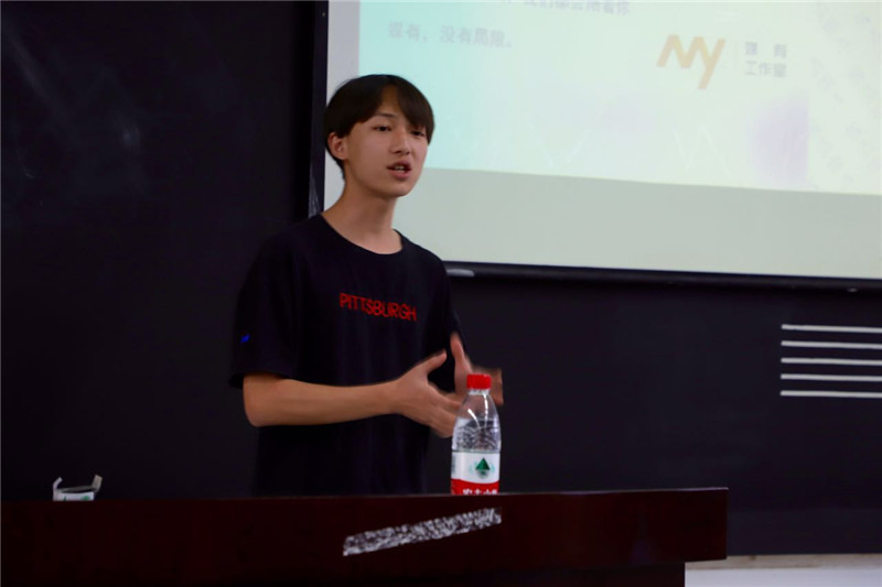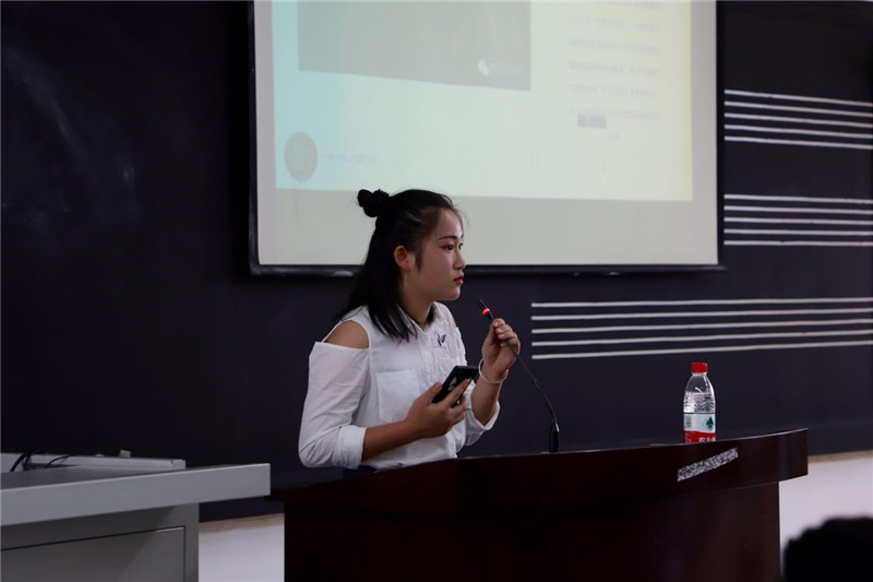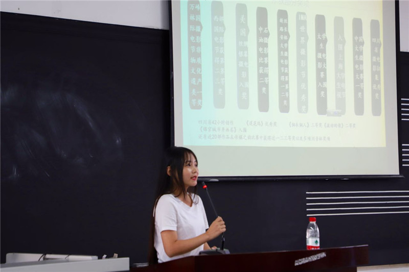 随后,传媒学院学生会主席李荣环上台介绍了属于传媒学院学生会的几大部门,详细介绍了每一个学生会部门的工作情况与职责所在,通过播放短视频让新生更加直观的了解到他们所心仪的部门。学生会部门介绍完毕后,传媒学院大学生记者团、“多背一公斤”学生公益团体以及传媒学院大学生艺术团的负责人先后上台发言,并通过短视频、PPT的形式向2017级同学们进行有趣的介绍。随后,隶属于传媒学院的开明映像学生工作室、鱼肆学生工作室、传声学生工作室等六个学生工作室的负责人先后对工作室现况和成绩进行了简要介绍,表达了参加学生工作室可以更有助于提升本专业能力的信息。