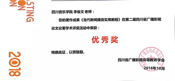 据悉,此次“学会奖”终审是在初审会件入围的130份作品的基础上进行终审。最终评出四川省大学生原创影视作品大赛(动画实验类)作品一等奖一名,二等奖二名,三等奖二名,优秀奖三名;四川省大学生原创影视作品大赛(记录类)作品一等奖一名,二等奖二名,三等奖三名,优秀奖五名;四川省大学生原创影视作品大赛(剧情类)作品二等奖三名,三等奖十名,优秀奖七名;四川省广播影视论文论著(论文类)作品特等奖一名,一等奖三名,二等奖四名,三等奖四名,优秀奖十名。传媒学院刘莉老师的论文《传媒艺术教育中新媒体技术运用思考——一种“技术中介”视角》获得论文类二等奖,李俊文老师的《当代播音实用教程》获得论著类优秀奖,学生王迪的影视作品《锦衣夜行》和胡超的《足球往事》获得剧情片优秀奖。