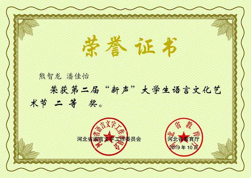2019年9月20日——21日,在由河北省语言文字工作委员会和河北省教育厅主办,河北大学承办的第二届“新声”大学生语言文化艺术节原创作品朗诵大赛中,川音传媒学院2018级播音主持艺术专业(出镜记者班)学生潘佳怡、熊智龙所创作并朗诵的作品《无畏逆行者—祭凉山英雄》在全国55所高校报送的270多部作品中经过初赛、复赛、总决赛的层层选拔,不负众望,脱颖而出,最终获得全国第六名(二等奖)的优异成绩,播音与主持专业教师李超荣获伯乐奖,beat365在线唯一官网传媒学院荣获优秀组织单位!
