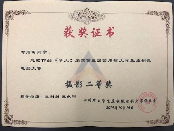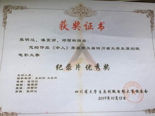 影制专业作品《伞人》在第五届四川省大学生原创微电影大赛中获得好成绩