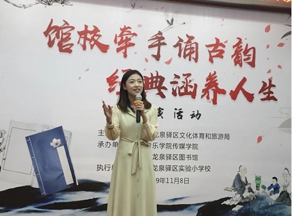 这场“馆校牵手诵古韵 经典涵养人生”诵读活动,是在为大力培育和践行社会主义核心价值观、弘扬中华民族优秀传统文化的背景下开展的。传媒学院播音与主持艺术专业学子利用有声语言表达优势,通过诵读将中国经典诗文作品带进校园,让中小学生能在经典诗文诵读中找到自己的兴趣,培养他们的阅读习惯,让他们感受到来自中国传统文化的独特魅力,让孩子们在潜移默化中提高文化和道德素质,增强民族自信心和自豪感,从而更好地传承中华经典文化、丰富群众精神文化世界,培育深厚文化氛围。