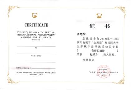 我院广播电视编导专业2014级学生潘楚乔作品《有形的翅膀》成功入围四川金熊猫电视节国际大学生影视作品评选活动。