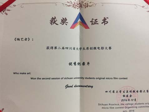 《编艺者》在四川省第二届大学生原创微电影大赛中获优秀纪录片奖