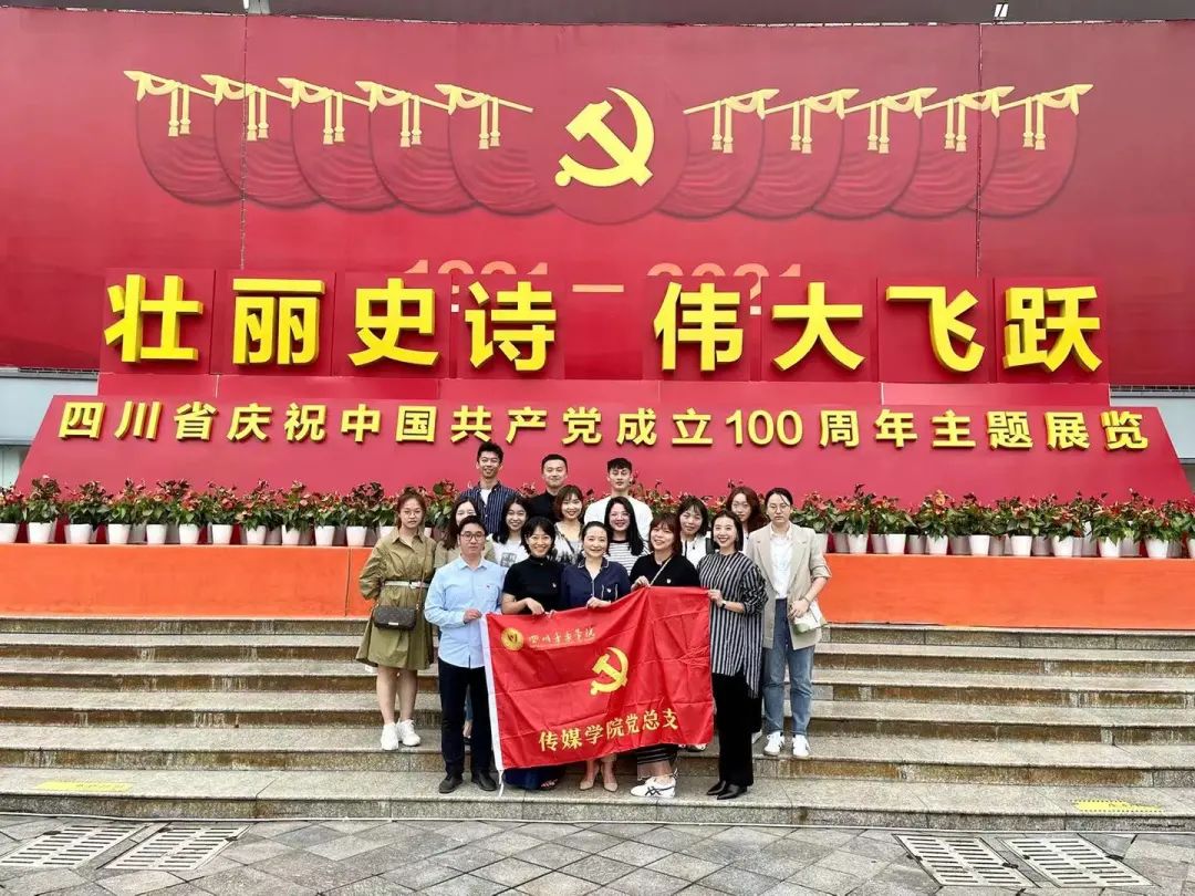 主题展览按照中国共产党百年历史的四个历史时期,划分为4大部分,分别是“浴血奋战换新天”“艰辛探索创伟业”“伟大变革铸辉煌”“民族复兴谱新篇”以及对应的24个单元。展览采取历史图片、文物史料、场景再现、音像视频、艺术呈现等形式聚焦中国共产党成立100年来的重大历史事件和光辉历程,多角度充分展示中国共产党在四川的发展历程。“通过这些生动的图片和史料,让我们对四川百年的革命史和党史有了更深的了解。”传媒学院党总支副书记刘莉说到。在参观过程中,刘莉副书记不断地向我们讲解她所了解的历史事件,引导党员教师们自由讨论,使大家对党的历史,尤其是党在四川的发展史,有了更进一步的了解。紧跟着刘莉副书记的步伐,传媒学院全体党员教师、党员学生代表都沉浸在1200余张历史图片和400余件文物实物所勾勒出的党的百年发展史画中,深刻感受到,在伟大的中国共产党的领导下,四川人民创造了一个又一个的人间奇迹。