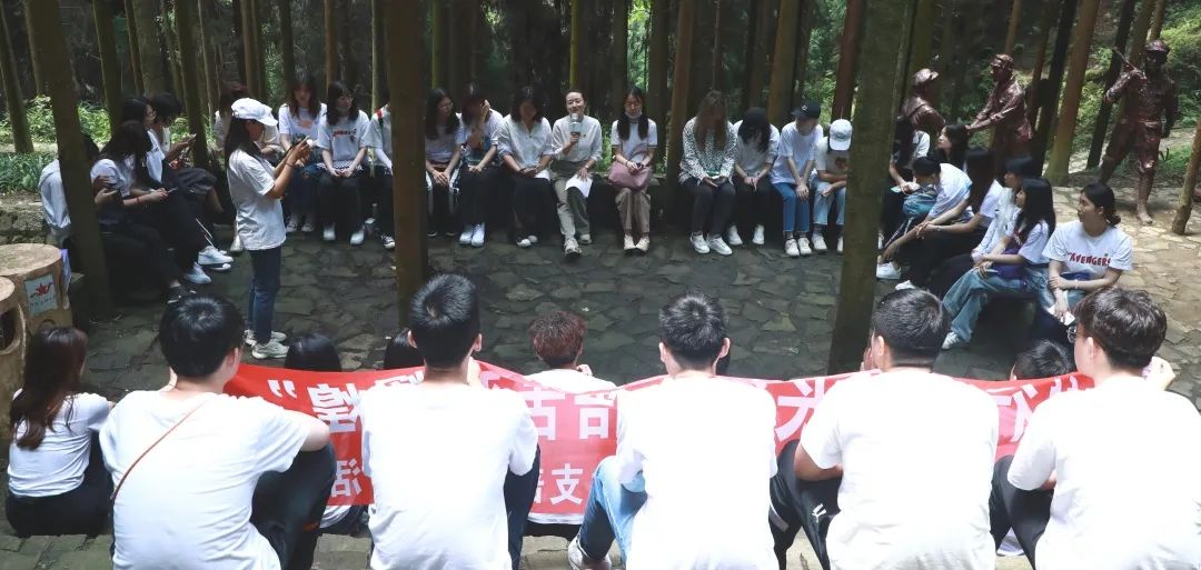 参观结束后,全体党员师生就地围坐在一起,在郁郁葱葱的树林间,刘莉书记给同学们上了一堂特别的党课。她讲了作为红军长征经历时间最长、重要战役战斗最多的省份,四川大地上铭刻了红军走过的诸多足迹。红军长征邛崃纪念馆位于邛崃市高何镇高兴村,是成都市区域内唯一的长征纪念地。1935年中国工农红军第四方面军长征途经邛崃时,曾打响天台山等十余个战役,建立起苏维埃政权。同学纷纷表示历史不应该被忘记,我们生活在和平美好的年代,更不应该忘记先辈们为此付出的努力。我们应将先辈们的革命精神和奉献精神铭记于心,不忘初心,坚定理想信念,继承革命传统,为实现中华民族伟大复兴的中国梦努力奋斗!随后学生代表朗诵了发扬长征精神、歌颂共产党的作品。