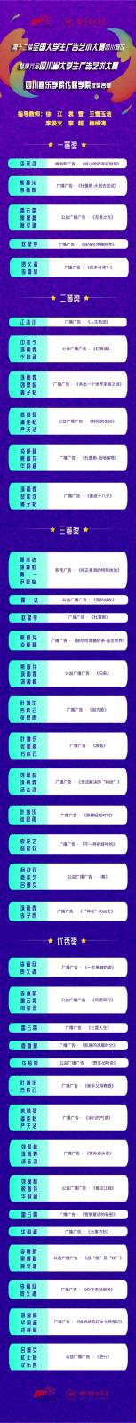 第十二届全国大学生广告艺术大赛四川赛区暨第六届四川省大学生广告艺术大赛近日落下帷幕,我院师生参赛成绩喜人、再创佳绩。由徐江、袁雪、王雪玉洁、李俊文、李超、柳维涛老师指导的38个作品在本次赛事中分获一、二、三等奖及优秀奖(其中一等奖5个,二等奖6个,三等奖12个,优秀奖15个)。