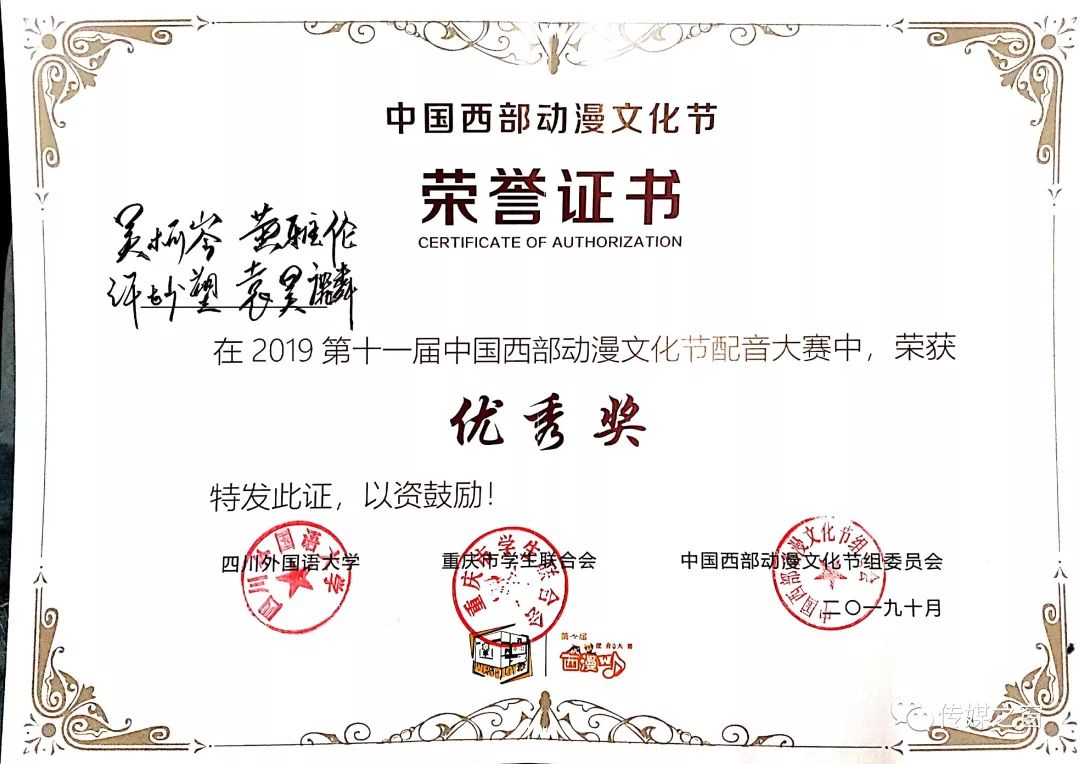 第十一届中国西部动漫文化节配音大赛10月2日在重庆国际会展中心落下帷幕,川音传媒学院参赛师生团队在本次大赛中发挥出色,获得二等奖一项,优秀奖三项,以及优秀组织奖和优秀指导教师奖的佳绩!