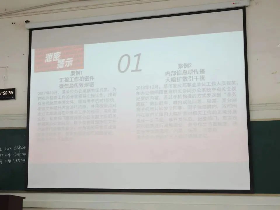 此次主题班会同学们认真听讲,积极提问。通过《社交媒体失泄密案例警示》的学习,同学们明白了涉密信息不上网,上网信息不涉密,保密规定千万条,严格落实最重要的道理。期望同学们能认真贯彻《中华人民共和国保守国家秘密法》,能时时谨记保密之重,刻刻警惕泄密之危,筑牢网络保密防线。