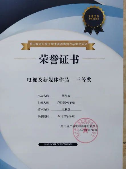 在第五届四川省大学生原创影视作品评优活动中,我院共有两部作品获奖,分别为:陶蕾、王政、郭梦涵三位同学主创的《地球漫游指南》荣获剧情片二等奖,卢诗源、韩子璇两位同学主创的《柳琴戏》荣获电视及新媒体作品三等奖。