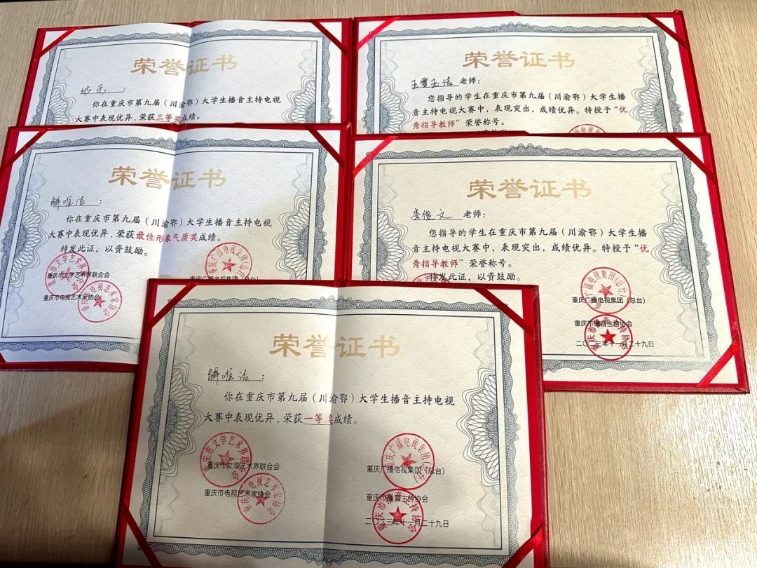 2023年11月23日由重庆市文学艺术界联合会、 重庆广播电视集团(总台)、重庆市电视艺术家协会、重庆市播音主持协会、重庆市广播电视协会播音主持专业委员会主办的第九届重庆市(川渝鄂)大学生播音主持电视大赛总决赛在重庆文联落下帷幕,川渝鄂三地共有34人进入大赛决赛,川音传媒学院共有2名同学参加决赛。最终经过激烈的角逐解唯洁同学获得一等奖和最佳形象气质奖,张乐同学获得三等奖,两位老师荣获指导教师奖。