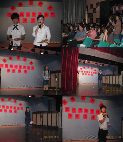 2008年10月17日下午2点,在4—104教室,题为“我的大学生活”演讲比赛的决赛在这里进行。12名选手经过激烈的角逐,2006级广电编导专业的宫腾飞同学以92分的成绩摘下此次决赛的桂冠。 这次演讲比赛活动由我系学生会组织,共有几十名同学报名参加,历时两周,经过初赛、复赛,最终12名学生脱颖而出进入决赛。 系主任王江、党支部副书记向武军以及教师代表和学生代表担任了此次决赛的评委。