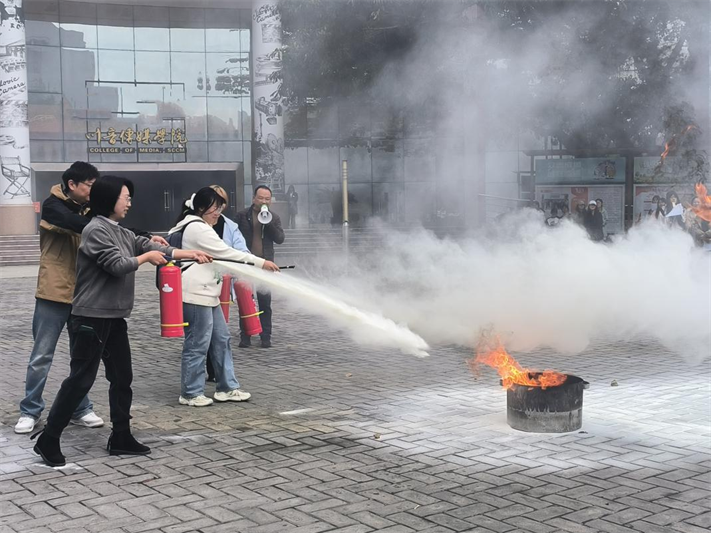 活动现场,学校保卫处老师对干粉灭火器的正确使用方法进行了讲解、示范、指导,强调使用灭火器要保持镇静,遇到火情千万不要慌乱失措,牢记“一晃,二拉,三压,四喷”要领,掌握正确的使用方法。同时还结合火灾事故案例,就用火用电、火场逃生、如何拨打119报警电话等一系列消防安全问题作了细致的讲解,并手把手地教学生们如何正确使用灭火器,现场学习氛围浓厚。此次消防疏散演练活动,有效增强了学院师生的消防安全意识,牢固树立“安全第一,责任重于泰山”的思想,同时进一步提高了师生们的自我保护能力和安全处置能力,为继续推进平安校园建设打下坚实基础。