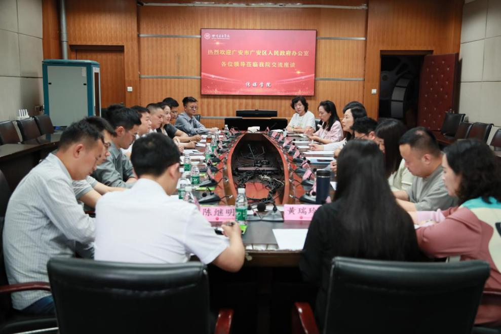 党委书记刘道莉首先对广安市广安区人民政府办公室张隽一行的到访表示热烈的欢迎,她从传媒学院的办学历史和办学定位出发,重点介绍了学院“以学生为中心、以产出为导向”的办学理念。一是以“乡村振兴”系列活动为抓手,形成特色鲜明的“学用创”应用型人才培养新模式,全力打造应用型人才培养特色。二是以专业特色为抓手,围绕产业需求,整合多方资源,搭建各类合作平台,发挥应用型专业的优势。三是以地方特色为抓手,形成校地合作,开展采风、实践等丰富多样的教学实践活动,促进地方经济发展,全力打造三全育人思政教育特色。刘书记表示,学院与地方开展合作是实现资源共享、优势互补、共同发展的重要途径。双方可以选择合适的领域,加强项目合作,促进成果转化,确保合作落到实处。
