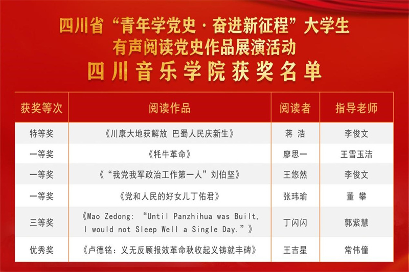此次大学生有声阅读党史作品展演活动是在庆祝中华人民共和国成立75周年、全省上下掀起学习宣传贯彻《党史学习教育工作条例》热潮、持续推动党史学习教育常态化长效化的重要阶段,引导大学生学党史、悟思想,从而推动全党全社会学好党史、用好党史的一项有力举措。主办方选取了王右木、江竹筠、邓稼先、兰辉、刘伯坚等22位四川党史上具有代表性的人物事迹,马克思主义在四川的传播、红军飞夺泸定桥、巴山来了共产党等23件发生在四川的重大党史事件作为有声阅读文本,印发给全省普通高校,由各高校组织学生开展党史学习教育和录制有声阅读音频作品。通过阅读党史作品、讲述党史故事,明理增信、崇德力行,展现新时代大学生蓬勃向上、奋发有为的精神风貌,凝聚强国建设、民族复兴的青春力量。