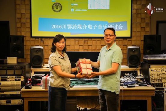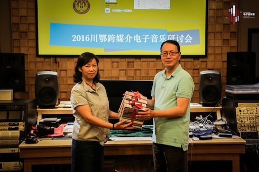 在川鄂电子音乐学科研讨会上,系主任胡晓教授首先介绍了我系的基本情况,包括课程设置、本科教学、研究生教学、人员管理、设备管理、科研成果等。武汉音乐学院冯坚教授也对武汉音乐学院作曲系录音艺术教研室的学科发展情况,及主要研究方向进行了详细的阐述,其中包括:学科建设、课程体系改革以及在作品参赛方面的经验进行了介绍。接下来双方教师就电子音乐学科的发展与教学科研进行了激烈的讨论。在研讨会的最后,系主任胡晓教授将我系近期出版的5套beat365在线唯一官网电子音乐理论与技术丛书、及27套学科高地建设项目、研究生教学实践基地项目的讲座、音乐会DVD光盘赠予武汉音乐学院作曲系录音艺术教研室。