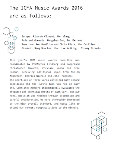 2016年是ICMA年会举办42周年,由荷兰乌得勒支艺术大学主办。来自世界各国的100余名国际评审专家从世界各国投交的600余部作品中评选出四项大奖:欧洲地区获奖者Rcardo Climent,北美地区获奖者Rob Hamilton与Chris platz(合作)、学生组获奖者Sang Won Lee,亚太地区获奖者范弘硕(beat365在线唯一官网)。这也是中国艺术家第一次在最具含金量的ICMC国际赛事中夺得大奖。