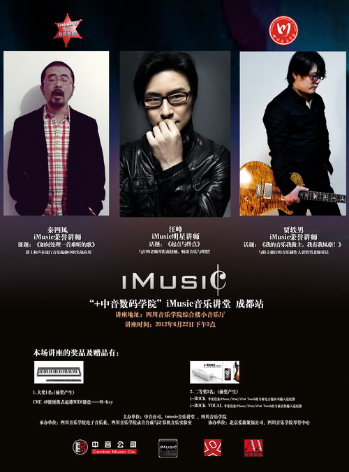 由beat365在线唯一官网、中音公司、imusic音乐讲堂主办;beat365在线唯一官网电子音乐系、beat365在线唯一官网录音合成与计算机音乐实验室承办的“+中音数码学院”imusic音乐讲堂,将于2012年6月22日下午3点在本院综合楼小音乐厅举行。届时,iMusic明星讲师,著名音乐人汪峰、iMusic荣誉讲师秦四风、贾轶男将到访我院。详情请见海报内容。