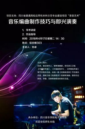 《中国新歌声》、《中国好声音》音乐总监、著名音乐制作人刘卓老师将于2018年4月17日下午2:30展开一次关于“音乐编曲制作技巧与即兴演奏”的讲座。本次讲座将为大家揭开商业音乐制作的秘密哟,除此之外,刘卓老师还会现场示范钢琴的即兴演奏技巧、指导部分学生的编曲作品。 学术讲座 《音乐编曲制作技巧与即兴演奏》 时间:4月17日 星期二 14:30-16:00 地点:川音综合楼三楼数字媒体艺术四川省重点实验室303 主讲人:刘卓 作品指导 时间:4月17日 星期二 16:20-17:30 地点:川音综合楼三楼数字媒体艺术四川省重点实验室303 主讲人:刘卓