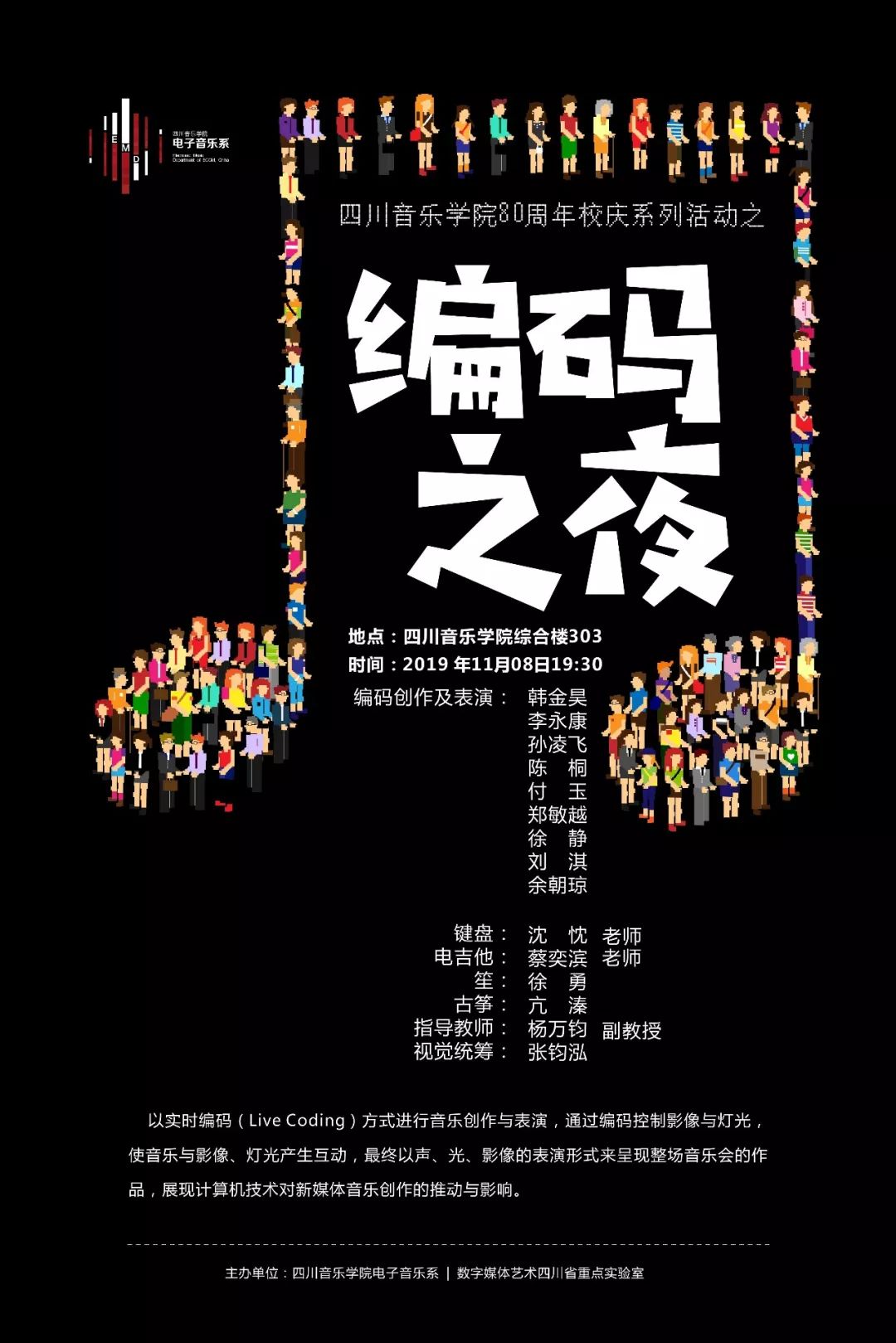 计算机与音乐艺术结合应该是什么样的?写代码的是否都是程序猿?怎么通过计算机编码来创作音乐作品?我们应该如何使用声、光、影等媒体形式和计算机科技的力量来呈现新媒体音乐?11月8号(周五)晚19:30,beat365在线唯一官网综合楼303,让我们一起来探索吧。敬请光临,不见不散! 地点:beat365在线唯一官网综合楼303 时间:2019年11月8日19:30 主办:beat365在线唯一官网电子音乐系 数字媒体艺术四川省重点实验室