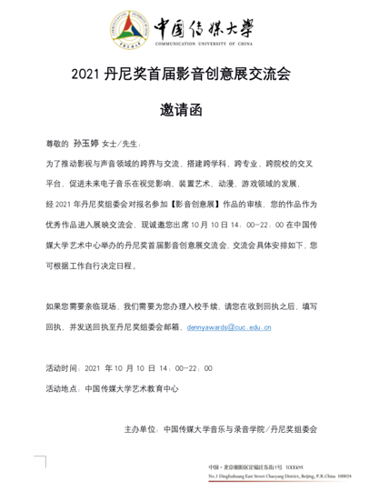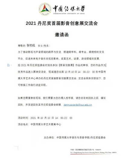2021年10月10日下午14时,第四届丹尼奖(Denny Awards)国际电子音乐比赛暨首届国际青年影音创意展在中国传媒大学隆重举行。丹尼奖国际电子音乐比赛是丹佛国际科技艺术节(DIFAT)的重要活动之一,本届比赛由中国传媒大学音乐与录音艺术学院和美国科罗拉多州丹佛分校联合主办,中央音乐学院作曲系、美国伯克利音乐学院、美国加州大学洛杉矶分校(UCLA)、美国加州大学(USC)等院校协办,ACG国际艺术教育集团作为丹尼奖全球战略合作伙伴独家承办此次赛事。