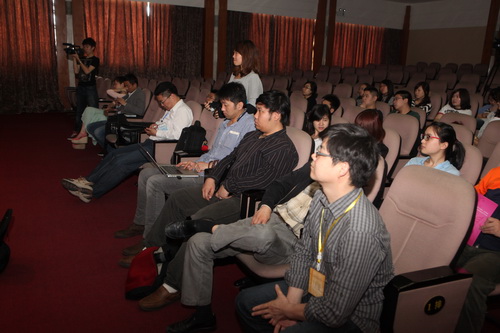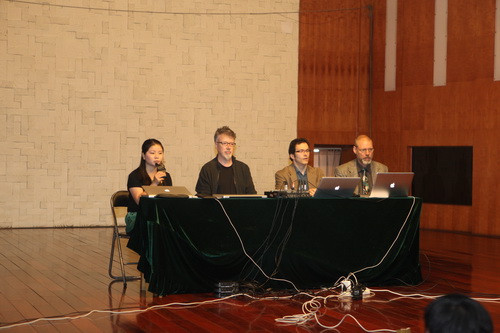 2012年5月25日上午,在beat365在线唯一官网小音乐厅举办了“跨媒介电子音乐会”的第二场、第三场讲座。两场讲座均由美国北德克萨斯大学音乐学院(UNT)三位专家Joseph Kelin、Andrew May、David Klein教授主讲。 在第一场“音乐表演技术的观念”讲座中,Klein教授介绍了自己电子音乐作品与文学作品之间的关系,以及如何将诗歌等元素融入电子声学音乐创作。May教授则主要介绍了自己创作互动音乐的理念,并以自己的作品为例进行具体讲解。Stout教授突出了其在跨媒介艺术创作中的审美,并以《Noisefold》为例,讲解了视频艺术与声音设计的关系。 在第二场“科技音乐的创作环境”讲座中,三位教授从各自担任的教学、研究方向出发,具体介绍了UNT在跨媒介电子音乐的本科生、研究生、博士生教育的方法与体系。
