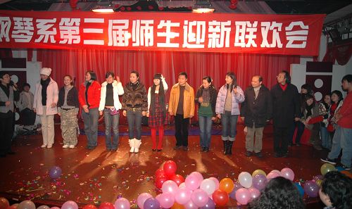 在辞旧迎新之际,钢琴系四百多名师生于2008年1月10日下午相聚在三圣乡“蜀仙园”,隆重召开“钢琴系第三届师生迎新联欢会”。 下午四点,师生们精神振奋的来到会场,人人脸上洋溢着节日的喜庆。王世才书记和许兵主任的新年贺词拉开了钢琴系迎新联欢会的序幕,表达了对全系师生的深切祝福和真诚的问候,在贺词中总结回顾了2007年的工作,对一年来全系师生齐心协力、团结拼搏所取得的成绩给予了充分的肯定,并对2008年钢琴系美好的未来寄予了殷切的希望,王书记和许主任情真意切的讲话赢得了师生们雷鸣般的掌声。 晚上聚餐后,联欢会正式开始。师生们同台同乐,用真情回想过去,展望未来,使整个会场犹如阳光明媚的春天,笑声、歌声、掌声交汇在一起,使“蜀仙园”的会场变成了欢乐的海洋。整个联欢会持续了两个多小时,会后全系师生还观看了“新年烟花”,虽然近日的连续降温为冬天更增加了几分寒意,但会场的气氛却暖意融融,本次的联欢会不仅为广大师生搭建了展示自己才艺的舞台,还挖掘了师生的潜能、启迪了学生的智慧、培养了广大师生的集体荣誉感,更促进了师生间的情感交流,同时也预祝着钢琴系的明天会更加美好!