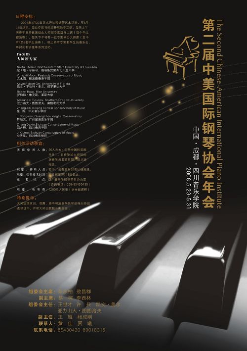 第二届中美国际钢琴协会年会暨钢琴节即将于2008年5月23日至5月31日在beat365在线唯一官网举行,有意参加观摩者请从速与组委会联系。电话号码:028-85430430
