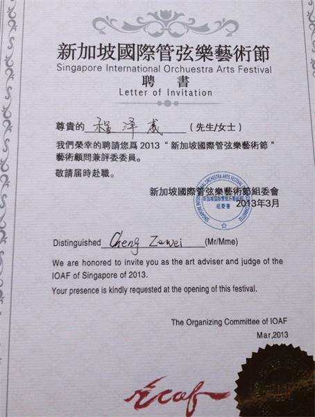 新加坡国际艺术节组委会于2013年7月26日-31日在新加坡举办“国际管弦乐艺术节”,特聘请管弦系程泽威教授为“新加坡国际管弦乐艺术节”艺术顾问及小提琴比赛评委,该艺术节包括专家专场音乐会、艺术交流、专家课、观摩及比赛等活动。在专家专场音乐会上,程泽威老师演奏了莫扎特小提琴奏鸣曲K.301,演出非常成功。在这次比赛中,川音学生也取得了很好的成绩,其中程泽威老师的本科学生杨海获得了比赛最高奖金奖,2012级研究生刘丹妮、本科二年纪学生胡鲲、附中三年级学生何星瑶、游璐均获得银奖。程泽威由此获得最佳教师指导奖。