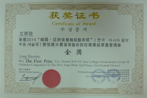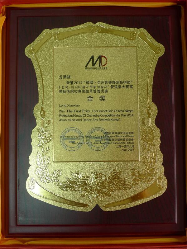 管弦系2013级本科生龙萧骁在今年8月于韩国首尔举行的“韩国•亚洲音乐舞蹈艺术节”中,发挥出了较高的竞技水平,经过激烈角逐,获得了高等艺术院校专业组单簧管独奏金奖,指导老师张庭愷获得优秀指导教师奖。 “韩国·亚洲音乐舞蹈艺术节”,是由新加坡国际音乐舞蹈交流促进会主办的一项具有国际性、权威性、专业性的艺术节活动及赛事。艺术节旨在推动亚洲各国音乐舞蹈艺术的整体发展,促进亚洲各国音乐舞蹈艺术文化交流,为优秀音乐人才提供进一步的发展空间,达到相互学习、合作交流、共同进步的目的。“韩国·亚洲音乐舞蹈艺术节”是亚洲各国艺术领域的盛会,为了提升艺术节的整体专业水平、保证艺术节的整体艺术品质,组委会邀请到众多国内外艺术名家、专业教授担任活动的艺术顾问和评委委员,希望可以由此推动亚洲艺术人才的教育与培养,使更多的艺术人才能够通过这个平台切磋技艺、展现自我、放飞梦想。