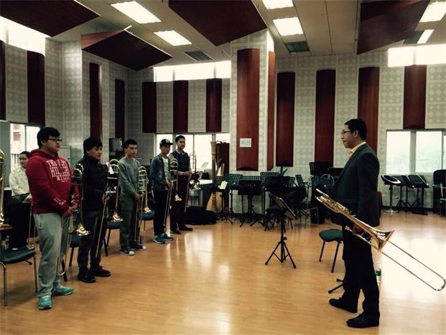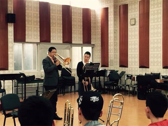受我系邀请,2015年4月8日-9日,国家大剧院低音长号王炜老师的大师班圆满结束。 历时两天的大师班课程,王炜老师通过示范、引导及讲解让学生从不同的角度去理解演奏的技巧和感受音乐本身的魅力。学生参与度极高,也纷纷表示通过王炜老师细致耐心的引导式教学,使自己打开了不同思路拓宽了眼界。 同学们在两天的课程中热情参与练习与讨论,彼此间也不停交流心得,课堂气氛活跃和谐。学生们纷纷表示非常欢迎这种教学活动,可以让自己能从不同角度审视自己的学习。也希望学院可以邀请更多专家前来,使同学们可以开拓思路,丰富自己的世界, 同时也让川音通过交流向外传递我们一直禀陈的优良严谨的教学形象。