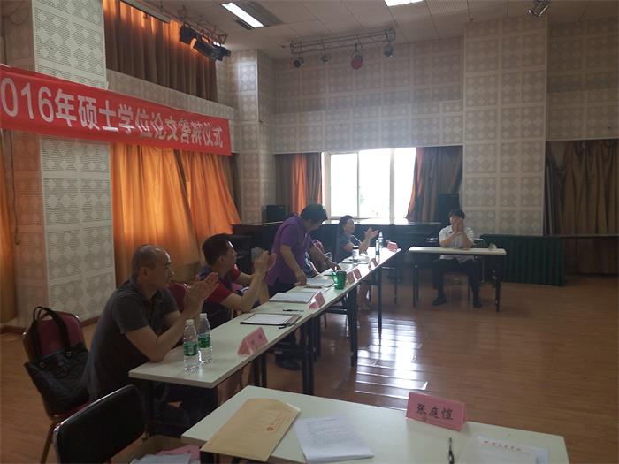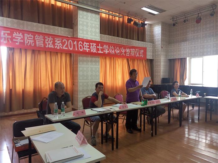 2016年6月12日上午,管弦系管乐教研室在学院琴房大楼二楼多功能厅,为管乐硕士毕业生徐翔、陈绪坤、陈叶丹、邵金强、杨雅婷举行了“2016届硕士研究生(管乐)毕业论文答辩会”。答辩委员会主席由谢岳教授担任,答辩委员会委员分别由杨华玉教授、杨熔副教授、何辉副教授、张文坤副教授、宋世彬副教授担任;答辩委员会秘书由张庭愷老师担任。