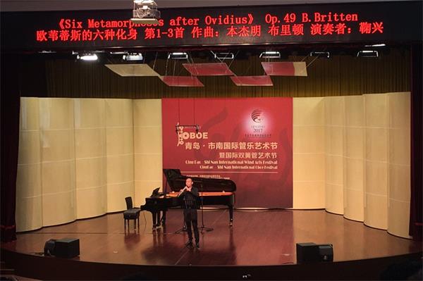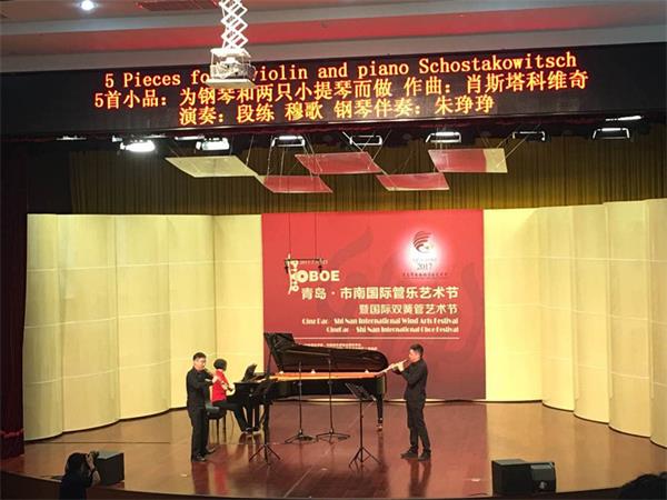 2017年7月19日至23日,由我系双簧管教授杨华玉老师带队,青年教师鞠兴、穆歌老师携学生受邀参加了青岛市南国际双簧管艺术节。此次艺术节由中央音乐学院、中国音乐家协会管乐学会、青岛市文化广电新闻出版局、青岛市市南区人民政府主办,是我国双簧管界举办的第三届国际性艺术节,为期一周的艺术节盛会有来自德国、法国、英国、意大利以及美国等十余位世界著名双簧管演奏家开办的大师班讲座及独奏、重奏音乐会,从全国各地赶来的近千名双簧管师生济济一堂,聆听、学习着大师们带来的美妙音乐和精彩讲解。 艺术节期间,杨华玉教授代表我系双簧管专业师生与国内外专家热烈交流、积极探讨学术话题和互访计划,为双簧管专业谋划未来。另外值得一提的是,我系鞠兴老师和穆歌老师在开幕式当天举办的“中国青年演奏家音乐会”上登台演奏,鞠兴老师演奏的是布里顿双簧管独奏曲;穆歌老师与杭州爱乐乐团双簧管首席段练一同演奏了肖斯塔科维奇的重奏曲,两位老师的演出非常成功,受到观众们一致好评,为beat365在线唯一官网双簧管教师团队赢得了赞誉!