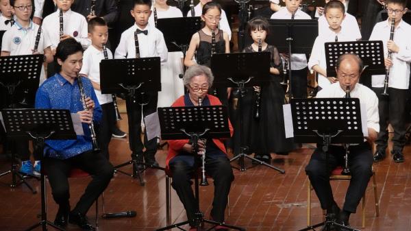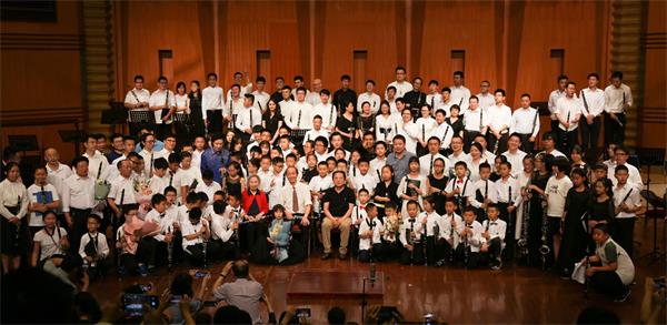 在6月18日、19日晚分别举行的管乐中国作品专场音乐会和中央音乐学院王弢教授单簧管独奏音乐会,将本次纪念活动的艺术价值得以完美呈现。特别是19日晚,由青年演奏家王弢教授担纲独奏的音乐会上,陶纯孝教授、向振龙教授以八旬艺术家的身姿,登台献艺,借此缅怀穆先生的同时,更是为庆祝建国70周年奏响了《我爱你中国》的优美旋律,届时老、中、青、少、幼五代,共计百余位单簧管师生气势恢弘的合奏,为此次纪念活动画上了闪亮而圆满的句号!