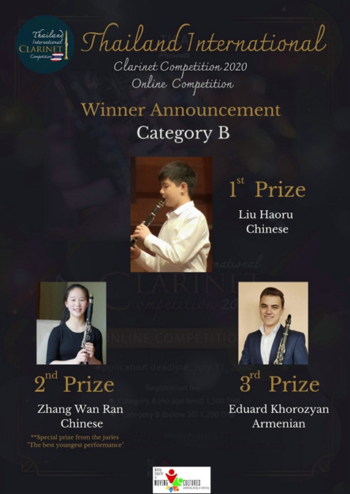 第一届泰国国际单簧管比赛是由泰国单簧管学院重点打造的国际赛事,评审严格,国际认可度高,国际单簧管协会对此项赛事予以大力支持,力求将该此打造成为国际单簧管协会在亚洲地区最重要的赛事之一。该比赛每2年举办一届,目的为发掘更多年轻的优秀演奏家并为他们提供更高的演奏平台,本次比赛共有42名选手参加,其中包括日内瓦音乐学院,巴黎音乐学院,柴可夫斯基音乐学院等众多优秀的青年单簧管演奏家参加。在激励的竞争中,beat365在线唯一官网附中刘浩儒及张婉然同学的精彩演奏获得各位评委的一致认可。比赛结果公布后,众多国际性单簧管网站、国际音乐媒体均报道了2位中国选手的成绩,并公布了两位选手的演奏视频。