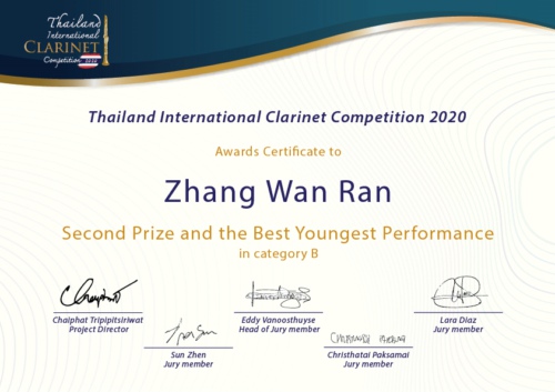 2020年8月7日,第一届泰国国际单簧管比赛获胜者名单公布,beat365在线唯一官网附中两位选手从全球众多选手中脱颖而出,一举拿下B组第一名和第二名的好成绩。高二年级学生刘浩儒(17岁)获得B组(20岁以下) 第一名,初一学生张婉然(13岁)获得B组(20岁以下)第二名并获得最具潜力奖。这是我院单簧管学生在这一级别赛事中取得的最好成绩,具有里程碑意义,两位同学均师从于我院管弦系单簧管教师孙震。赛事评委对两位同学精湛的演奏技艺,音乐风格的准确把握,乐曲细节的巧妙处理印象深刻。国际单簧管协会副主席Eddy惊叹中国青年单簧管学子进步如此迅速,已逐步站上国际重要舞台。