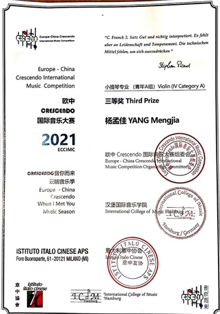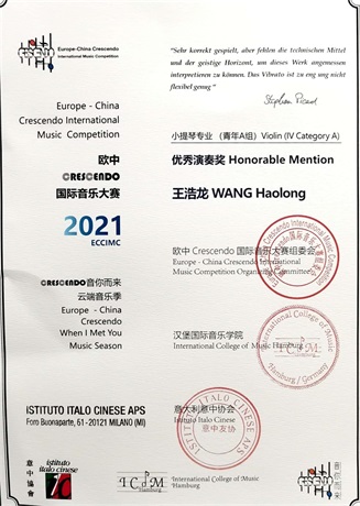 近日,享誉全球的“Crescendo”意大利国际音乐比赛落下帷幕,管弦系小提琴专业学生获得优异成绩,青彦言老师获得优秀指导教师奖!