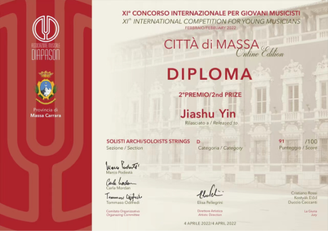 在近期结束的由意大利Diapason音乐协会举办第十一届“Città di Massa”国际音乐比赛中,我院小提琴、中提琴专业学生获得好成绩。