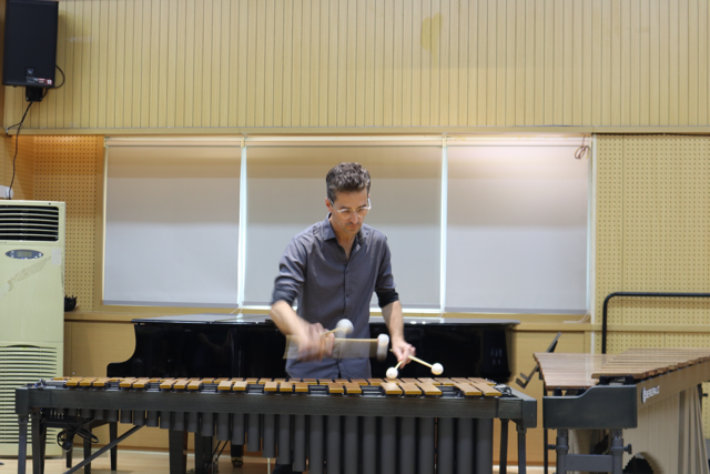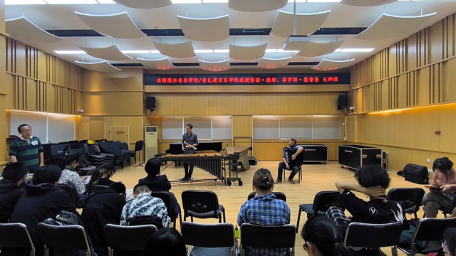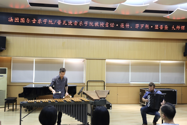 2023年10月24日周二下午2:30,来自法国的艺术家雷诺.德特给我们带来颤音琴的大师课,雷诺.德特首先和手风琴演奏家菲罗朗.瑟普查教授一起演奏了一首二重奏曲目,精彩的演奏获得了全体师生们的热烈欢迎。雷诺.德特教授的演奏以爵士音乐风格为主,对颤音琴的声音和延音踏板的使用控制非常优美和精准,尤其使用琴槌在琴键止音方面有非常高超的水平,使学生们对颤音琴的演奏有了更新的认识。雷诺.德特教授还专门系统的讲解了颤音琴的即兴演奏方法。在指导学生演奏的同时,也邀请学生一起参加进来学习即兴演奏,效果非常好。同学们的学习热情也是非常高涨,大师课取得了超预期的效果。同学们的演奏也得到了德特教授的高度评价和认可。