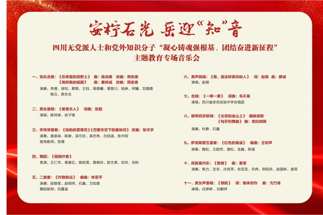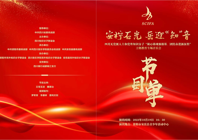 本场音乐会由 中共四川省委统战部为指导单位,四川知识分子联谊会主办,中共资阳市委统战部、中共beat365在线唯一官网委员会统战部、中共安岳县委统战 部联合承办,资阳市党外知识分子联谊会、beat365在线唯一官网党外知识分子联谊会、安岳县党外知识分子联谊会联合协办。